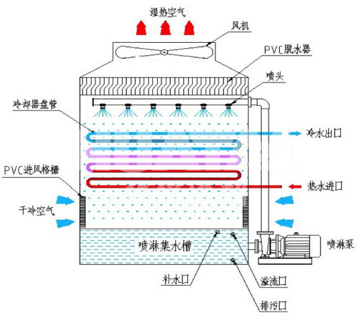 工作流體(純水或其它液體)在閉式冷卻塔的盤管中循環(huán),工作流體的熱量經(jīng)過盤管散入流過盤管的水中,同時機組外的空氣從盤管底部側(cè)面上的進風格柵進入,與水的流動方向逆向,逆向流經(jīng)盤管,一小部分水蒸發(fā)而吸走熱量,熱濕空氣由冷卻塔頂部的排風機排到大氣中;其余的水則落入底部水槽中,由水泵再循環(huán)至水分布系統(tǒng)又淋回到盤管上。